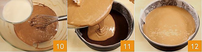 Quando o creme de leite estiver em temperatura ambiente, adicione-o ao creme 10 e misture até obter uma mistura homogênea. Retire a base de biscoito, que estará bem firme, e despeje sobre ela metade do creme de chocolate 11, espalhando-o uniformemente 12. Deixe descansar na geladeira por pelo menos meia hora; cubra o restante do creme de chocolate com filme plástico e reserve em um local fresco (não na geladeira, caso contrário, ele se firmará demais).