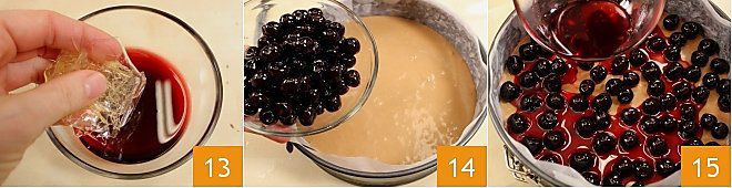 Enquanto isso, prepare a calda de cerejas: escorra bem as cerejas e reserve 100 ml de xarope. Amoleça a gelatina em água fria por 10 minutos, escorra bem e derreta no xarope 13. Após o tempo de descanso, retire a cheesecake e despeje sobre ela as cerejas 14 e o xarope com a gelatina 15. Coloque o bolo novamente na geladeira para firmar por pelo menos meia hora.