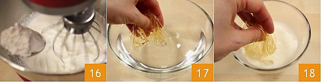 Enquanto isso, prepare o creme de chantilly: em uma batedeira com batedor, ou com uma batedeira elétrica, bata o creme de leite em neve (aqui nossa Escola de Cozinha: como bater o chantilly), reservando 1-2 colheres de sopa para derreter a gelatina, com 1 colher de sopa de açúcar de confeiteiro 16; reserve algumas colheres de sopa de chantilly para a decoração final. Amoleça 8 g de gelatina em água fria, escorra 17 e derreta em 1-2 colheres de sopa de creme de leite quente 18.
