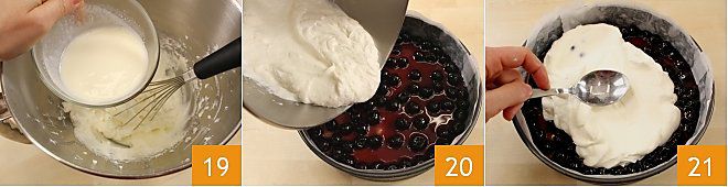 Quando o creme de leite com a gelatina estiver em temperatura ambiente, incorpore-o ao chantilly batido 18 e misture. Retire o bolo e forme agora a camada de creme de chantilly: despeje o creme sobre as cerejas 20 e espalhe uniformemente com as costas de uma colher 21. Coloque a cheesecake na geladeira novamente por mais meia hora.