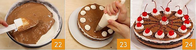 Após o tempo necessário, despeje sobre a base o restante do creme de chocolate 22, formando uma camada uniforme com uma espátula. Coloque a cheesecake para firmar na geladeira pela última vez, por mais meia hora. Após este tempo, a sua cheesecake floresta negra está pronta para ser decorada: esprema tufos de chantilly com um saco de confeitar com bico estrelado 23 e decore a gosto com cerejas ao licor ou frescas e granulados de chocolate 24.