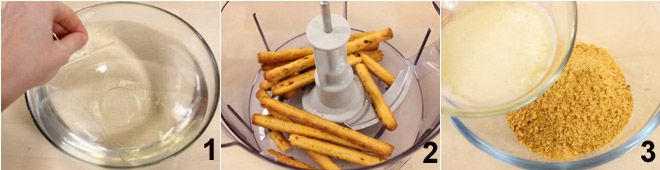 Para preparar as cheesecakes salgadas com ervas, comece colocando as folhas de gelatina em uma tigela com água fria, deixe amolecer por cerca de 10 minutos 1 e, em seguida, escorra bem. Coloque os biscoitos de tomate no processador 2 e triture finamente, depois adicione a mistura triturada à manteiga derretida 3 e misture bem até obter uma massa macia.