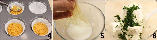 Pegue uma forma de muffin e forre com forminhas de papel, distribua a mistura obtida nas forminhas (mais ou menos uma colher por forminha) e achate e nivele as bases com as costas de uma colher 4. Coloque tudo para esfriar na geladeira por pelo menos meia hora. Enquanto isso, prepare o recheio: derreta a gelatina amolecida e bem escorrida no creme de leite 5 (para evitar que fiquem pedaços de gelatina na água, recomenda-se coar com uma peneira). Em seguida, coloque em uma tigela a ricota, o cream cheese, o sal, a pimenta e as ervas picadas (salsinha, manjericão e cebolinha) e misture bem 6.