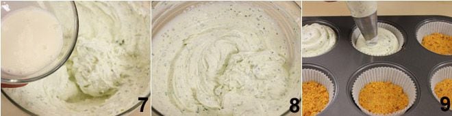 Despeje o creme de leite na mistura de queijo com ervas 7 e misture até obter um creme homogêneo 8, depois, com a ajuda de um saco de confeiteiro, distribua o creme sobre a base da cheesecake 9. Coloque as cheesecakes na geladeira por pelo menos mais uma hora para firmar a gelatina. Retire então com muito cuidado as cheesecakes salgadas com ervas das forminhas de papel e sirva.