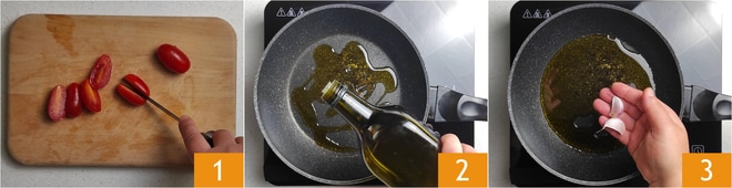 Para preparar a cheesecake salgada com pesto e tomatinhos, a primeira coisa é dedicar-se ao preparo dos tomatinhos confit. Lave os tomatinhos e seque-os com papel toalha ou com um pano de prato limpo, depois corte-os ao meio 1. Em uma panela, coloque o óleo 2 e adicione o alho 3.