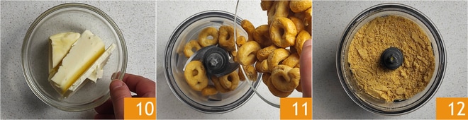 Para preparar a base, derreta a manteiga 10, no micro-ondas ou em uma panela em fogo baixo. Coloque os biscoitos taralli no processador 11 e triture até obter uma farinha 12.