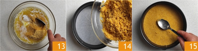 Transfira os biscoitos triturados para uma tigela e adicione a manteiga derretida morna, depois misture 10 até obter uma mistura com consistência arenosa. Despeje a mistura em uma forma de 20 cm de diâmetro 20, previamente untada e forrada com papel manteiga. Nivele com as costas de uma colher 15. Coloque a forma na geladeira para firmar a base.
