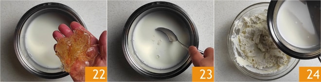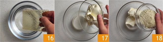 Coloque a gelatina de molho em água fria 16. Enquanto isso, dedique-se ao preparo do creme de queijo: em uma tigela, misture a ricota, o queijo cremoso 17 e o Grana Padano DOP ralado 18.