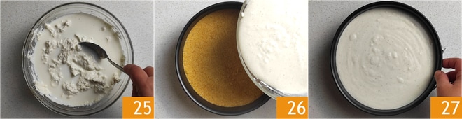 Misture 25 até obter um creme bastante líquido e homogêneo. Retire a forma da geladeira e despeje o creme sobre a base 26, movimente a forma para nivelar o creme 27 e coloque-a novamente na geladeira por uma hora.