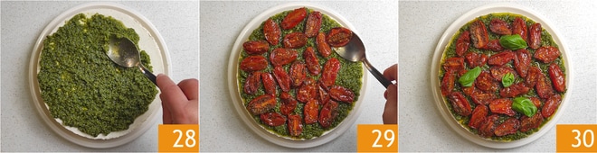 Após o tempo de descanso, retire a cheesecake da forma e espalhe o pesto na superfície 28. Decore com os tomatinhos confit 29 e algumas folhas de manjericão 30. A cheesecake salgada com pesto e tomatinhos está pronta para ser apreciada!