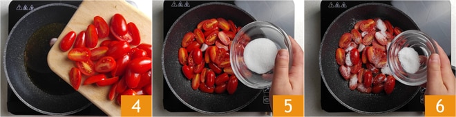Coloque os tomatinhos na panela 4, adicione o açúcar 5, distribuindo-o uniformemente sobre todos os tomatinhos, e ajuste o sal 6.