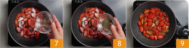 Tempere também com a pimenta 7 e o orégano 8. Cozinhe em fogo alto por cerca de 8 minutos, ou até que o açúcar esteja caramelizado 9. Reserve os tomatinhos confit.