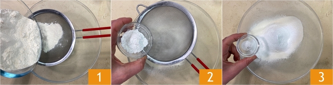 Para preparar a chiffon cake laranja e chocolate, primeiro peneire a farinha tipo 00 em uma tigela grande 1, passo fundamental para obter uma consistência macia. Em seguida peneire também o fermento em pó para bolos 2 e adicione uma pitada de sal 3.