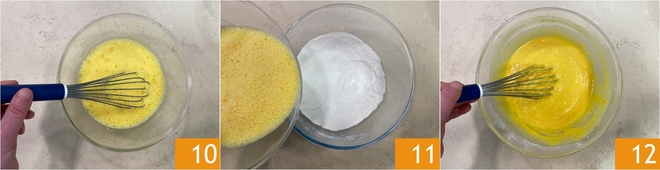 Misture tudo com um batedor até obter uma mistura bem incorporada 10. Despeje então a mistura líquida na tigela com os ingredientes secos 10 e misture sempre com o batedor de mão até obter uma massa lisa e homogênea, sem grumos 12.