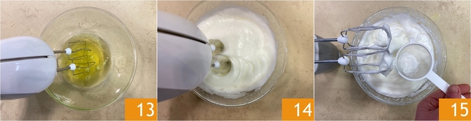 Em outra tigela perfeitamente limpa, comece a bater as claras com as batedeiras elétricas 13. Quando estiverem quase em ponto 14, peneire o cremor tártaro diretamente na tigela 15.