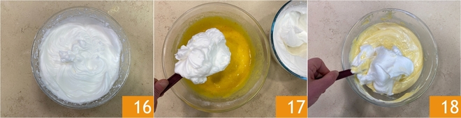 Continue a bater com as batedeiras elétricas até que as claras estejam perfeitamente em ponto 16. Retire uma primeira parte das claras em neve e incorpore-a à massa 17. Misture delicadamente com uma espátula fazendo movimentos de baixo para cima para não desinflar a mistura. Acrescente então as claras restantes aos poucos, continuando a incorporá-las com a mesma delicadeza 18.