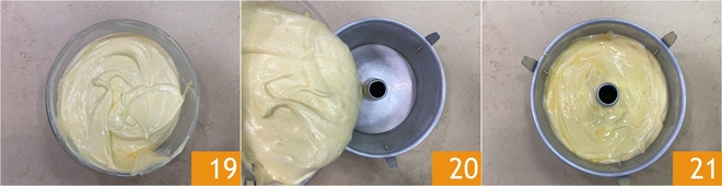 Você obterá assim uma massa macia e bem incorporada, muito arejada 19. Neste ponto prepare a forma de chiffon cake, que não deve ser untada: esse tipo de massa precisa de "agarrar-se" às paredes da forma para crescer corretamente durante o cozimento. Despeje então a massa na forma 20, nivele muito delicadamente sem bater a forma 21 e coloque-a na primeira prateleira inferior do forno. Asse em forno estático pré-aquecido a 160 B0C por cerca de 55 minutos.