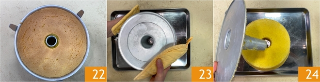 Após o tempo indicado, faça o teste do palito. Uma vez assada, retire a chiffon cake do forno 22 e vire imediatamente a forma sobre uma assadeira, que ficará elevada graças aos pés específicos 23. Deixe o doce esfriar completamente nessa posição: é um passo fundamental para evitar que o bolo murche e para manter sua característica estrutura alta e macia. Quando o bolo estiver completamente frio, desenforme com cuidado retirando primeiro a base 24 e transfira-o para um prato de servir.