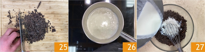 Enquanto isso, prepare a cobertura de chocolate: pique finamente o chocolate meio amargo 25 e coloque-o em uma tigela. Aqueça o creme de leite fresco em uma panelinha e leve-o quase a ferver 26. Neste ponto despeje o creme quente sobre o chocolate picado 27.