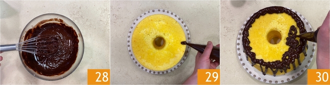 Misture com um batedor até obter um creme liso e brilhante, com o chocolate completamente derretido 28. Deixe a cobertura amornar até que atinja uma consistência um pouco mais espessa. Distribua então a cobertura, deixando-a escorrer primeiro pelas laterais 29 e depois cobrindo a superfície da chiffon cake 30. Para maior praticidade, você pode usar um saco de confeitar.