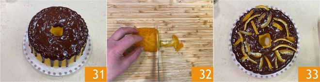 Quando a chiffon estiver bem coberta com a cobertura 31, corte a laranja cristalizada em tirinhas 32 e use-as para decorar o bolo 33. Sua chiffon cake laranja e chocolate está pronta para ser servida!