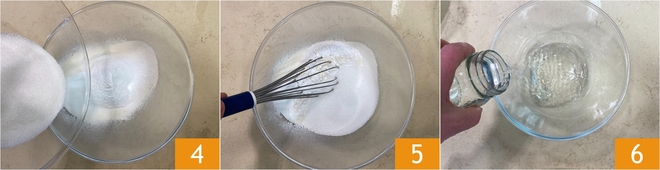 Adicione também o açúcar granulado 4, então misture bem todos os ingredientes secos com um batedor de arame para distribuí-los de forma uniforme. Neste ponto, dedique-se aos ingredientes líquidos: pegue uma segunda tigela e acrescente a água em temperatura ambiente 6.
