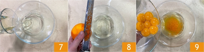 Adicione também o óleo vegetal 7. Perfume com as raspas de uma laranja 8 e por fim junte as gemas 9.