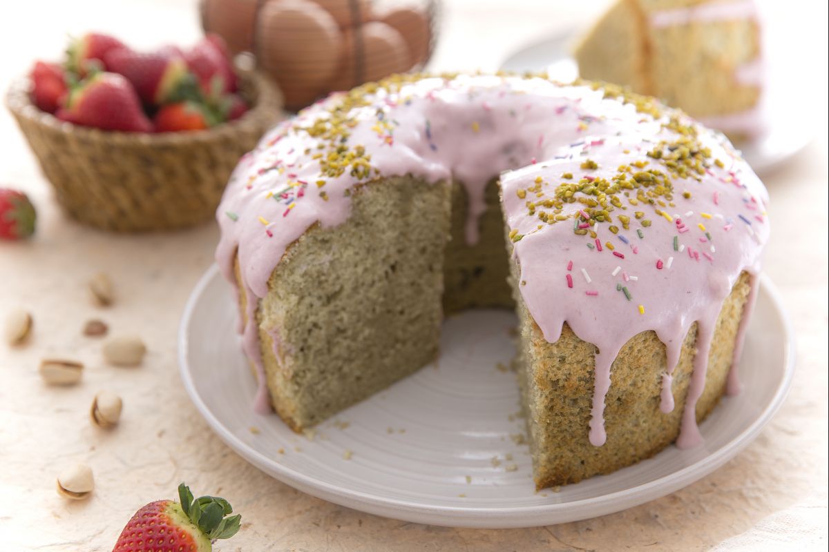 Para decorar o bolo chiffon multicolorido, você pode usar uma "cascata" de glacê doce de frutas vermelhas, tão macia e deliciosa, decorada com granulado de pistache. O bolo chiffon multicolorido é um deleite de sabores e cores, tudo para saborear. Enriqueça o buffet de doces de Carnaval com esta receita deliciosa!