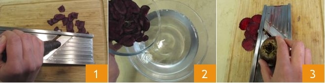 Para preparar as chips de tubérculos e maionese de gengibre, comece lavando bem todos os tubérculos, pois você os usará com a casca. Prepare duas tigelas de água com gelo: você precisará delas para separar os tubérculos de cor clara dos de cor escura. Ajuste o mandolim para a espessura de 1 mm e comece a preparar todos os tubérculos: corte as pontas das cenouras roxas, fatia-as e mergulhe-as em uma tigela com água fria 2, depois fatie a beterraba 3 e coloque as chips obtidas na mesma tigela.