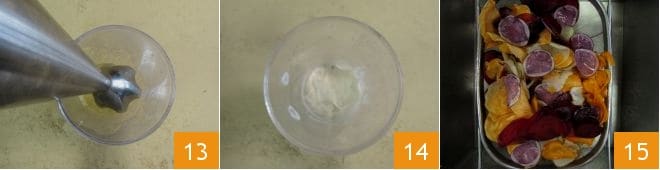 Bata tudo com um mixer de imersão 13 e sua maionese vegana de gengibre estará pronta em um instante 14. Retire os vegetais da imersão, escorra bem 15