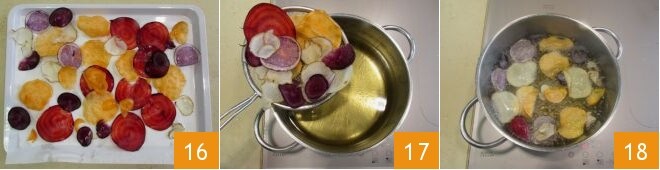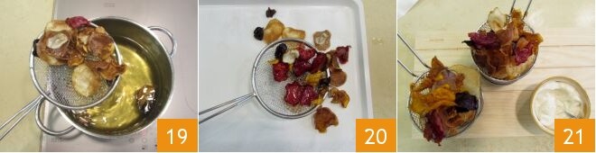 e coloque-os em uma bandeja forrada com papel absorvente para eliminar o excesso de água 16; deixe de lado até que estejam completamente secos. Neste ponto, aqueça o óleo de sementes em uma panela, levando-o à temperatura de 180° (a ser medida com termômetro de cozinha) e frite poucas chips de cada vez (17-18).