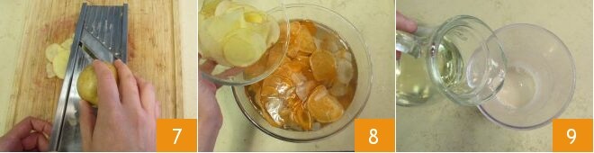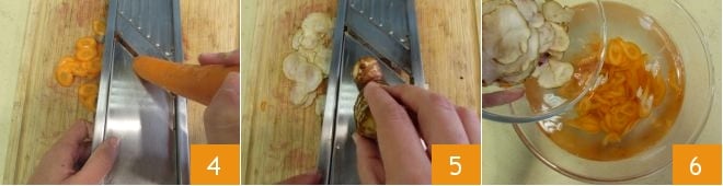 Fatie na mesma espessura também as cenouras amarelas, cuja ponta você já cortou anteriormente 4, e a alcachofra de Jerusalém 5, depois mergulhe esses tubérculos na outra tigela com água gelada 6.