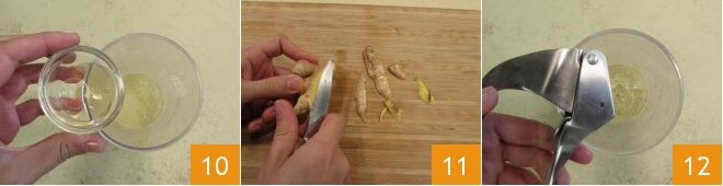 o sal e o vinagre 11. Limpe o gengibre 11, corte-o em pedaços e esprema-o com um espremedor de alho para adicioná-lo à mistura 12; como alternativa, você pode picá-lo.