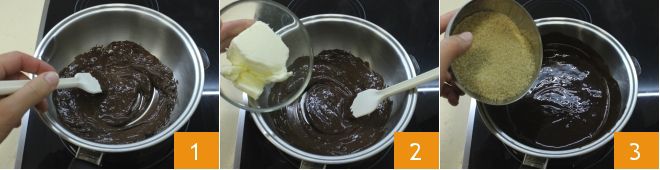 Para preparar os cookies de chocolate crackle, comece derretendo o chocolate amargo em banho-maria: encha uma panela com um quarto de água, coloque uma tigela por cima, adicione os pedaços de chocolate (como alternativa, você pode usar gotas de chocolate amargo) e cozinhe em fogo bem baixo, até que o chocolate adquira uma consistência líquida 1. Em seguida, adicione a manteiga 2, continuando a mexer com uma colher de pau para misturar tudo. Continue adicionando o açúcar mascavo 3.