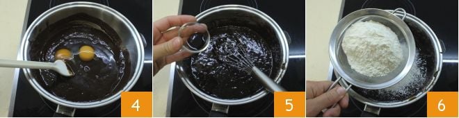 Adicione os ovos 4 e misture. Prossiga juntando o extrato de baunilha ou um sachê de vanilina 5 e misture com um batedor. Despeje a farinha e o fermento em uma peneira e peneire-os diretamente na panela 6.
