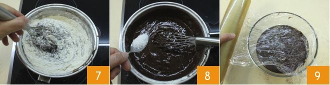 Continue a misturar com o batedor 7, até que os ingredientes secos estejam bem incorporados ao restante da mistura. Finalmente, adicione o sal grosso 8, depois desligue o fogo e transfira a mistura para uma tigela. Deixe esfriar ligeiramente e cubra com filme plástico 9, então deixe a massa endurecer na geladeira por cerca de 1 hora.