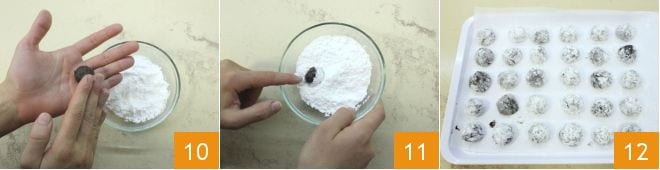 Passado esse tempo, retire a massa da geladeira, retire o filme plástico e comece a modelá-la em pequenos pedaços, formando bolinhas com cerca de 10 g cada 10. Em seguida, despeje o açúcar de confeiteiro em uma tigela e passe as bolinhas de massa que você formou 11, depois forre uma bandeja com papel manteiga e disponha as bolinhas açucaradas bem espaçadas umas das outras 12. Coloque a bandeja na geladeira e deixe descansar por pelo menos meia hora.