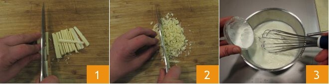 Para preparar o chocolate branco com menta, pique o chocolate branco (1-2). Despeje o leite em uma panela e acenda o fogo médio, depois adicione o amido de milho 3 e misture com o batedor.