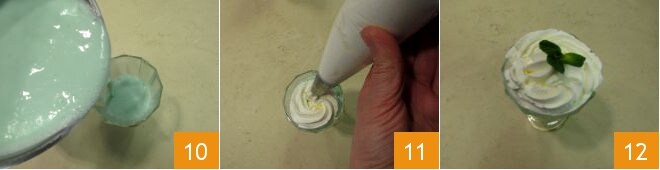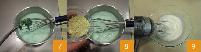 Desligue o fogo, remova as folhas de menta 7 e adicione o chocolate branco picado 8. Mexa novamente com o batedor para derreter. O chocolate quente branco com menta está pronto. Agora bata o creme de leite com a batedeira 9 e coloque-o em um saco de confeitar.