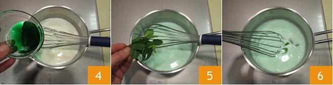 Adicione o xarope de menta 4, depois as folhas de menta 5, mexa continuamente e leve para ferver (isso levará cerca de 4-5 minutos).