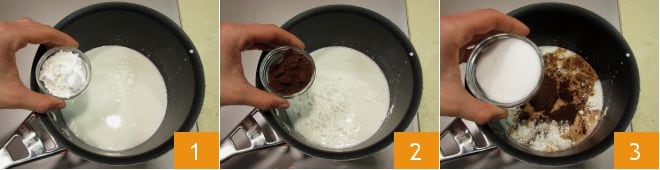 Para preparar o chocolate quente com café, prepare primeiro o café: você vai precisar de 30 g. Depois, pique o chocolate amargo e reserve. Despeje o leite na panela junto com o amido de milho 1, adicione também o cacau 2 e o açúcar 3,