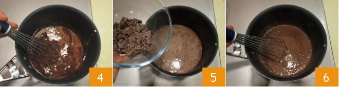 misture 4 e leve para ferver em fogo médio, mexendo continuamente com um batedor; isso levará cerca de 4-5 minutos. Assim que ferver, o chocolate terá engrossado, então adicione o chocolate picado 5. Continue cozinhando apenas o tempo suficiente para derreter o chocolate, sempre mexendo 6.