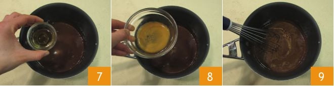 Retire do fogo e adicione o conhaque 7 e o café 8, misture novamente 9 e seu chocolate está pronto.