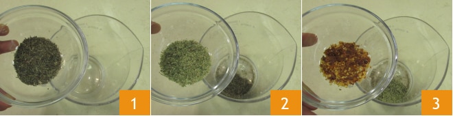 Para fazer o choripan, primeiro prepare o Chimichurri: coloque o tomilho seco em uma tigela 1, junto com o orégano seco 2 e a pimenta vermelha esmagada 3.