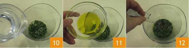 Por fim, adicione a água 10 e o azeite de oliva extra virgem 11, misture bem 12 e deixe descansar em temperatura ambiente por pelo menos uma hora.
