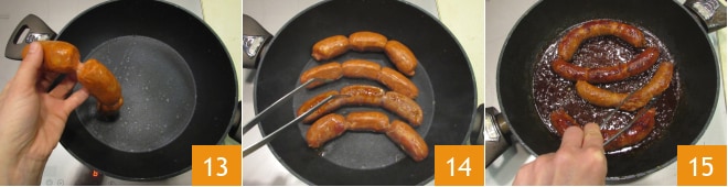 Após o tempo de descanso, passe para o cozimento do chorizo: aqueça bem uma frigideira grande e doure as linguiças em fogo médio-alto por cerca de 5 minutos 13, virando-as frequentemente para evitar que queimem 14. Cubra com a tampa e cozinhe por mais 5 minutos até que fiquem bem douradas 15.