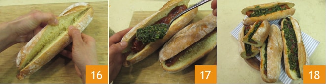 Neste ponto, corte o pão ao longo sem separar completamente as duas metades 16. Adicione o chorizo no interior e cubra com bastante molho chimichurri 17. Seu choripan está pronto para ser saboreado 18!
