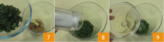 Junte também as folhas de salsa previamente lavadas e secas 7, o sal 8 e o vinagre 9.