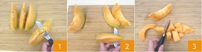 Para preparar os chupitos de melão com trouxinhas de feta, comece limpando o melão. Corte o melão em fatias e remova as sementes e os filamentos internos 1. Passe a faca entre a casca e a polpa para descascar cada fatia 2 e, por fim, corte a polpa em pedaços grandes 3.