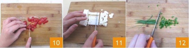 Por fim, corte as tiras para obter cubinhos 10. Reserve-os e passe ao feta. Corte-o primeiro em tiras e depois em cubinhos 11 aproximadamente do mesmo tamanho que os dos tomatinhos. Pique finamente a cebolinha 12.